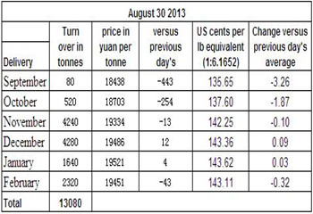 Average prices on the China National Cotton Exchange (CNCE) were mostly down. The nearby September and October deliveries traded on small volume, and were down by 443 and 254 yuan per tonne, respectively, while the December and January deliveries witnessed small gains of 12 and 4 yaun per tonne.