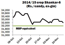 The Cotton Corporation of India is reported to be procuring seed cotton actively at the Minimum Support Price. CCI has extended operations to Gujarat, according to local reports, though purchases there have thus far been limited in volume. Interior asking rates for Shankar-6 have eased by Rs. 150 since yesterday, to Rs. 32,600 per candy, ex-gin, still marginally above the lint equivalent of the MSP, by our calculation. At the prevailing exchange rate, the equivalent dollar value is around 67.80 US cents per lb.