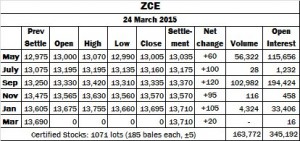 Cotton futures on the Zhengzhou Commodity Exchange (ZCE) increased across the board. The nearby May contract gained 60 yuan to settle at 13,035 yuan per tonne and the most active September contract was up by 120 yuan to finish at 13,370 yuan per tonne. The May/September spread widened to 335 yuan, while that for September/January narrowed to 340 yuan.