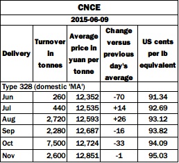 Average prices on the China National Cotton Exchange (CNCE) ended mixed. The July and August deliveries were at 12,535 and 12,593, up by 14 and 26 yuan, respectively. Other deliveries finished down by between 1 and 70 yuan.