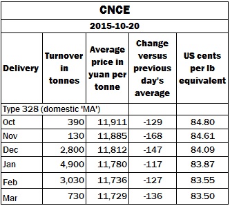 Average prices on the China National Cotton Exchange all dropped today. The December delivery was down by 147 yuan at 11,812 yuan per tonne, the January delivery reduced by 117 yuan to 11,780 yuan per tonne and the February delivery declined by 127 yuan to 11,736 yuan per tonne.