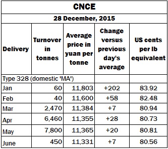 On the China National Cotton Exchange (CNCE) today, contracts settled higher, the largest increases were in the nearby month, March and June ended with single digit gains. The aggregate turnover decreased by 8,480 to 17,280 tonnes.