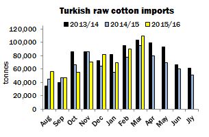 Raw cotton imports in March amounted to 109,574 tonnes – believed to be the highest monthly total on record. The total for the first eight months of the (August/July) statistical season is raised to 581,449 tonnes, which compares with the 538,129 tonnes imported during the same period of the 2014/15 season.
