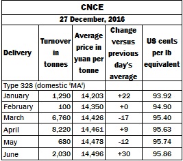 On today’s China National Cotton Exchange’s e-trading platform, March and May decreased slightly, while the remainder settled with small gains and February contract unchanged. Turnover rose by 3,170, to 19,080 tonnes.