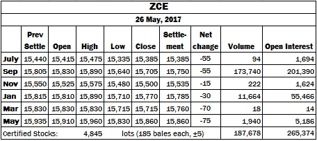Zhengzhou cotton futures lost grounds in all contract month today, in a range from 15 to 75 yuan per tonne. The actively-traded September decreased by 55 yuan, while January 2018 contract lost 30 yuan, resulting the broadening of spread between the two months by 25 yuan, to 35 yuan (January premium).