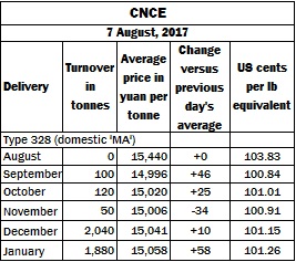 Most average prices on the China National Cotton Exchange’s e-platform closed with moderate gains of between ten and 58 yuan per tonne, though November declined by 34 yuan , to 15,006 yuan per tonne. Turnover decreased by 140, to 4,190 tonnes.