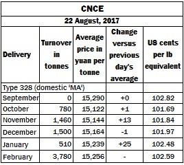 Average prices on the China National Cotton Exchange’s e-platform closed today with small changes. The August delivery has expired and the forward February 2018 contract is now priced at 15,256 yuan per tonne. Turnover rose by 1,430, to 8,030 tonnes.