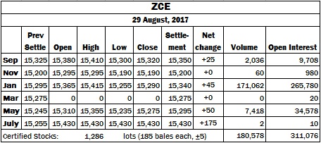 Cotton futures on the Zhengzhou Commodity Exchange continued to rise in most deliveries, ranging from 25 to 175 yuan per tonne. The January 2018 contract increased by 45 yuan, while September rose by 25 yuan, resulting in a discount for the January contract of ten yuan over September, 20 yuan less than in the previous day.