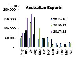 A total of 177,369 tonnes were shipped during July, up from a revised figure of 154,487 tonnes the previous month and just short of 35 percent above the 131,619 tonnes recorded in July 2016.