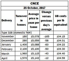 Average prices on the China National Cotton Exchange’s e-platform failed to resume yesterday’s upward trend by losing between 12 and 165 yuan per tonne, in all deliveries. Turnover increased by 690, to 7,490 tonnes.