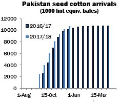 According to the Pakistan Cotton Ginners’ Association (PCGA), arrivals of seed cotton during the first half of December amounted to the equivalent of 553,907 bales of lint; this represents a fall in comparison with the previous fortnight (the figure for which was 773,521 bales), but a gain of nearly 50 percent, when considered in relation to the equivalent two-week period a year ago when the figure was 369,490.