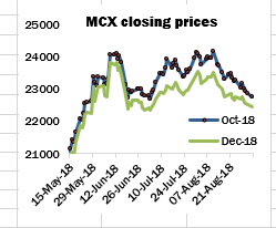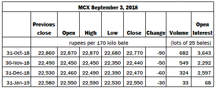 MCX futures have recovered some modest ground so far today. By around 13.00 IST, the October contract had gained ₹50 from its previous close, having last traded at ₹22,820 per bale (just over ₹47,735 per candy).
