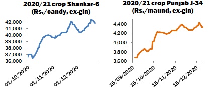 Domestic prices for raw cotton have seen modest changes today. Shankar-6 is quoted at ₹41,850 per candy, ex gin (72.25 cents per lb). Punjab J-34 is slightly firm at ₹4,333 per maund (71.25 cents per lb).
