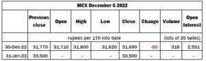 So far today, the price has fallen further. By 14.30 IST, December had last traded at ₹31,620 per bale (₹66,145 per candy), down ₹70 from the previous close.