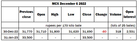 So far today, the price has fallen further. By 14.30 IST, December had last traded at ₹31,620 per bale (₹66,145 per candy), down ₹70 from the previous close.