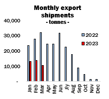 At 37,345 tonnes, aggregate exports for the first quarter of this year amount to just 45 percent of those a year earlier.