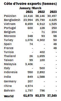 March shipments were destined mainly for Pakistan (6,418 tonnes), Bangladesh (2,927) and Vietnam (1,125).