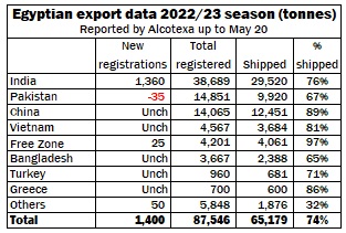In the week to May 20, Alcotexa registered a further 1,400 tonnes for export, while over 4,200 were shipped. Almost all the new business was for India. Orders now amount to 87,546 tonnes, and nearly three quarters have been dispatched. The average price for Giza 94 was low at 108 cents per lb, but observers comment that this probably indicates the new registrations were actually agreed some time ago, before the recent rise in price.