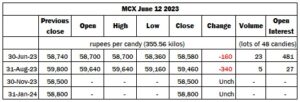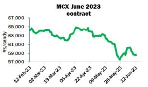 So far today, the nearby contracts continue to move lower. By 13.05 IST, June had last traded at ₹58,300 per candy, down ₹280 from last night’s close.