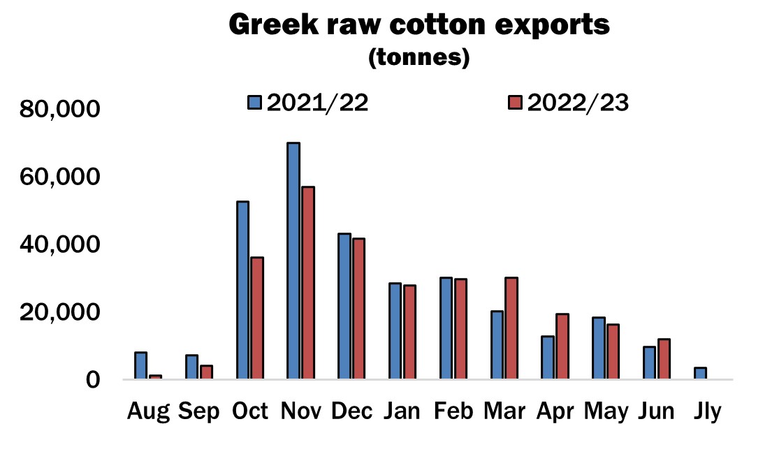 During June, raw cotton export shipments amounted to 11,882 tonnes, down by almost 4,500 tonnes from the total in May. The major destination was Egypt (7,432), followed by Turkey (2,446) and Indonesia (1,141).