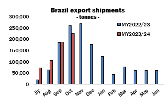 Logistical bottlenecks have continued to disrupt shipments to both overseas markets and for local deliveries. Exports for the month of October totalled 225,700 tonnes, up from about 186,500 the month before but below the figure of 260,000 tonnes recorded in October 2022. The volume shipped during July/October is just over 589,000 tonnes, which represents an increase of nearly 12 percent in relation to the same four months a year earlier.