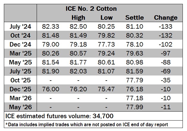 Nearby months finished between 88 to 133 points lower. July ’24 futures opened at 82.33 cents/lb (-10) and immediately lost ground, falling 51 points lower within the first 45 minutes of the session. The spot month traded to the downside over the next few hours until briefly moving to modest gains, reaching a high of 82.50 cents/lb (+7) around 0730 GMT. Resistance was met and the lead month fell back under pressure, dropping to triple-point losses and to a low of 80.25 cents/lb (-218) by 1445 GMT. July cotton moved off its low but traded under pressure over the rest of the day to settle at 81.10 cents/lb (-133).