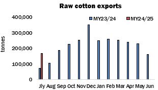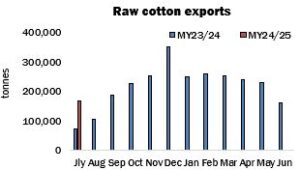 Raw cotton exports in July totalled 167,213 tonnes, versus just over 160,411 the previous month and 72,624 a year earlier. The total is in fact the highest in recent history for the month of July. That is a reflection of the ‘year-round’ nature of export activity and the absence of any significant pause between the movement of one crop and the next – the consequence of the strong growth of production in recent seasons.