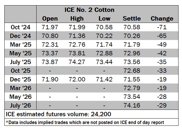 Nearby months ended to the downside, settling on losses ranging between 35 to 71 points. December ’24 futures opened at 70.80 cents/lb (-11) and lost a few points, dropping 14 points lower as soon as the market opened. The most active contract quickly reversed course, moving to positive ground and reaching a high of 71.36 cents/lb (+45) by 1200 GMT. The nearby month met some resistance, and a mixed tone ensued until December cotton decisively fell to the downside around 1435 GMT and continued to meet resistance, eventually falling to a low of 70.22 cents/lb (-69) late in the session. The most active contract ended near the bottom of its range at 70.26 cents/lb (-65).