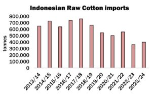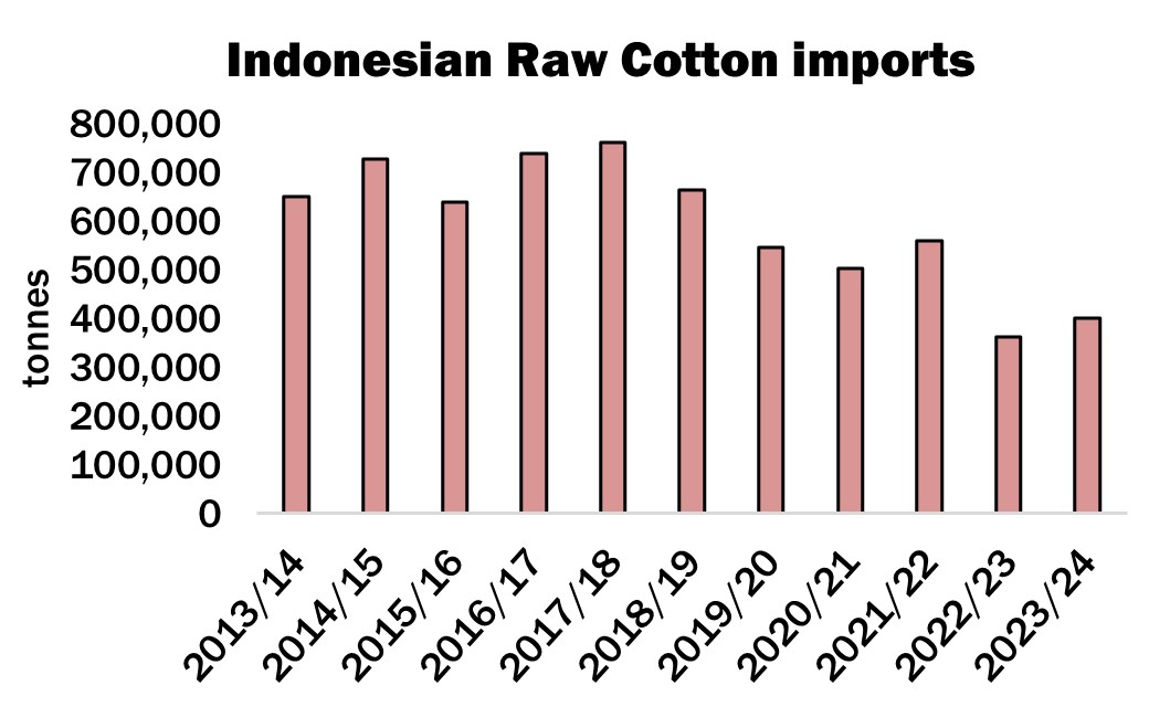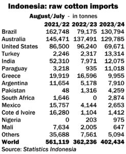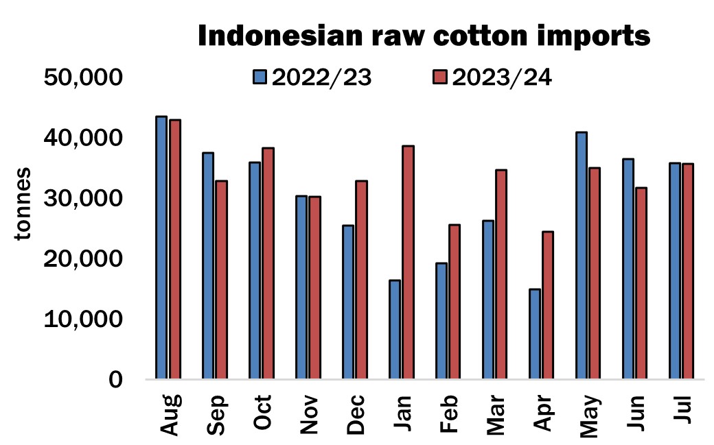 Raw cotton imports totalled 35,675 tonnes in July, higher than the 31,625 delivered in the previous month but slightly below the 35,801 recorded a year earlier. Australia and Brazil accounted for 34 and 33 percent, respectively, while the United States supplied 20 percent.