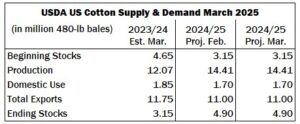 World numbers reflected slightly higher output at 120.96 million (versus 120.46 million in February) and higher consumption at 116.54 million (up from 115.95 million in the previous estimate). Global ending stocks are now projected at 78.33 million bales, lower than February’s 78.41, with China holding 37.67 million bales (up from 37.42 last month). World exports were modestly increased, now projected at 42.71 million, compared with 42.51 the previous month. USDA said, “Higher production for China more than offsets reductions for Pakistan and Argentina. Consumption is raised for Pakistan, Bangladesh and Egypt, more than offsetting small changes elsewhere. Exports by Brazil and Turkey are increased, exceeding reductions for Australia and Egypt. Imports by China are lowered but are more than offset by increases for Pakistan, Bangladesh and Egypt. Ending stocks for 2024/25 are lowered 80,000 bales.”