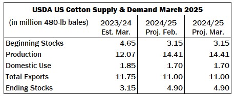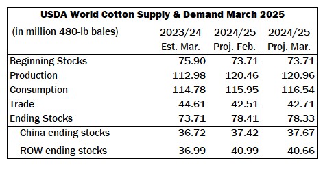 World numbers reflected slightly higher output at 120.96 million (versus 120.46 million in February) and higher consumption at 116.54 million (up from 115.95 million in the previous estimate). Global ending stocks are now projected at 78.33 million bales, lower than February’s 78.41, with China holding 37.67 million bales (up from 37.42 last month). World exports were modestly increased, now projected at 42.71 million, compared with 42.51 the previous month. USDA said, “Higher production for China more than offsets reductions for Pakistan and Argentina. Consumption is raised for Pakistan, Bangladesh and Egypt, more than offsetting small changes elsewhere. Exports by Brazil and Turkey are increased, exceeding reductions for Australia and Egypt. Imports by China are lowered but are more than offset by increases for Pakistan, Bangladesh and Egypt. Ending stocks for 2024/25 are lowered 80,000 bales.”