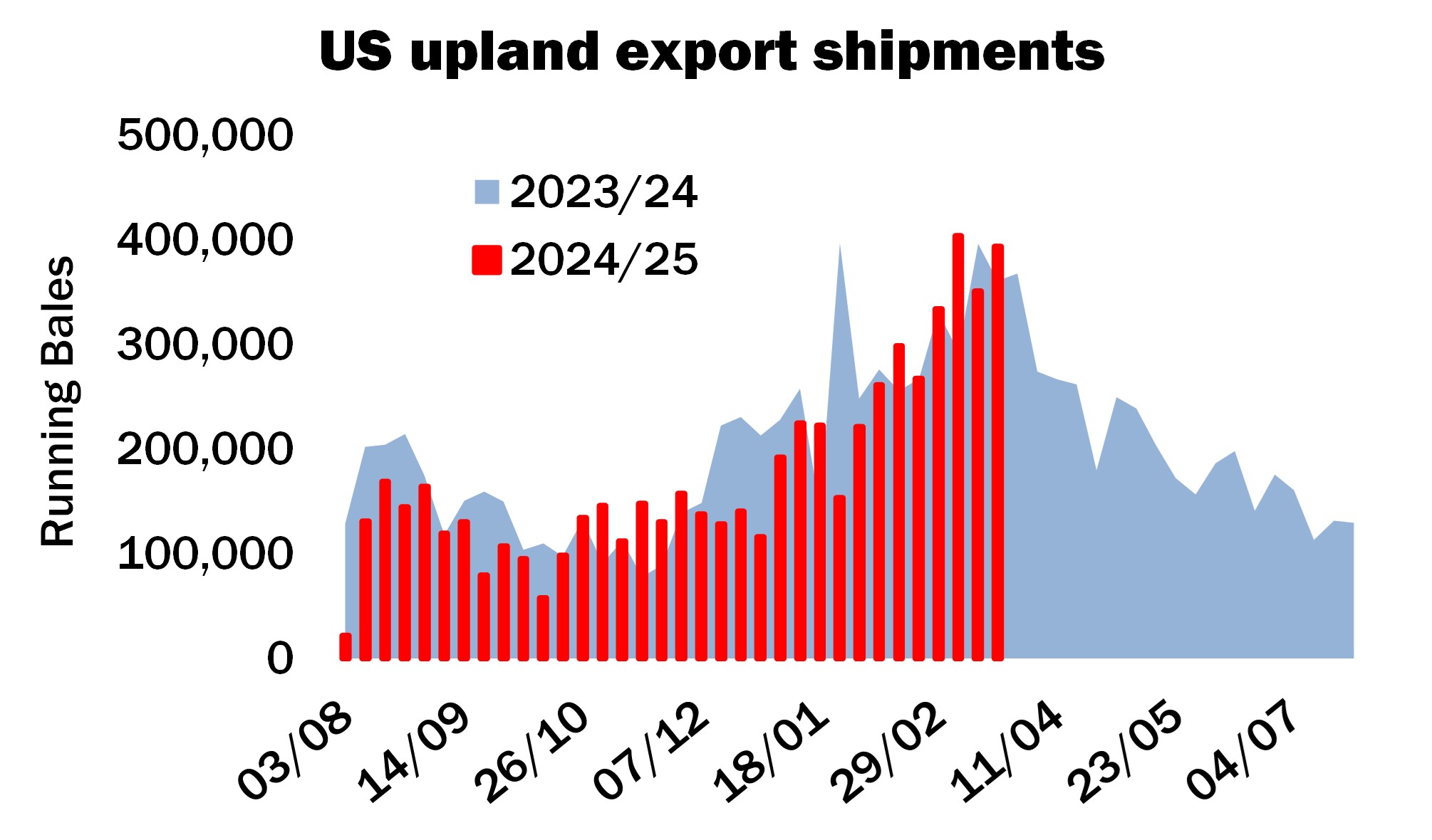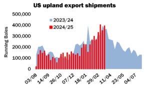 For the 2025/26 marketing year, 41,600 running bales of upland cotton were registered, attributed mainly to Malaysia (17,600 bales), Thailand (12,300), Honduras (7,500), Mexico (2,600) and Japan (1,600).
