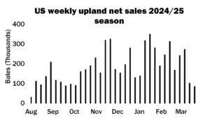 In the week ended March 20, the net upland sales commitment rose by 84,400 running bales, attributed mainly to Pakistan (35,300 bales), Vietnam (18,900), Turkey (16,900), Bangladesh (14,600) and Thailand (9,600). Reductions were noted for China (27,000), Mexico (2,800), El Salvador (100), and Guatemala (100).