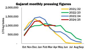 The GujCot Trade Association has issued its pressing report for April. A total of 998,566 bales (169,756 tonnes) were ginned in Gujarat during the month, down from 1.01 million in March. The tally for the season so far is now 6,778,071 bales (1,152,272 tonnes), higher than the total at the same point in 2022/23, but lower than the comparable figure in all other seasons in recent memory. The total for the end of April represents 95 percent of the Cotton Association of India’s estimated final total for the state of 7.1 million bales (1.2 million tonnes).