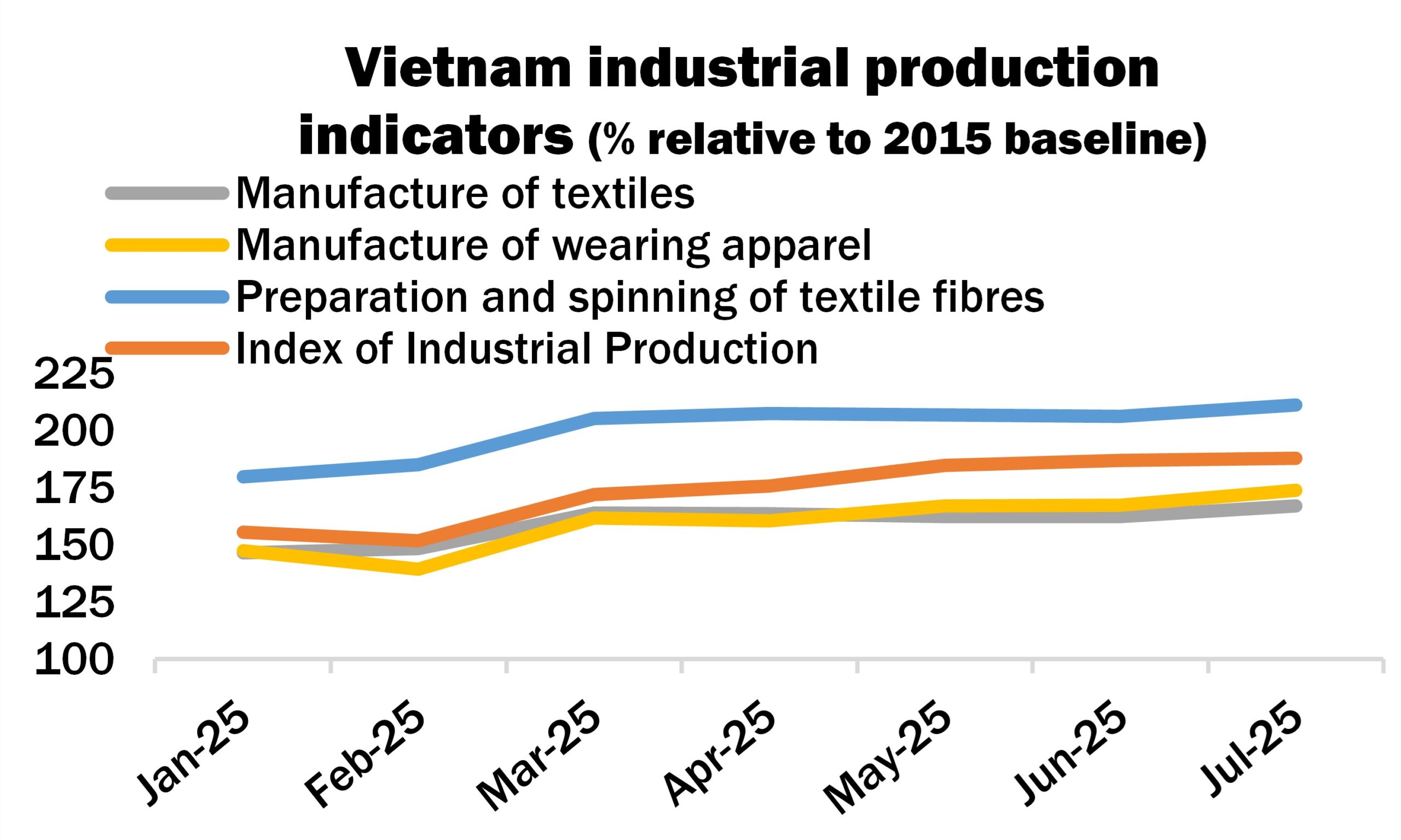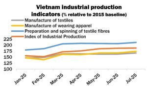 The index for the preparation and spinning of textiles fibres rose by five points on a monthly basis, to 211.1. For textiles manufacturing, the figure was 167.1 in July, versus 162.3 in June. The index for the manufacture of wearing apparel also increased, from 167.2 to 173.9, a rise of 6.7 points.