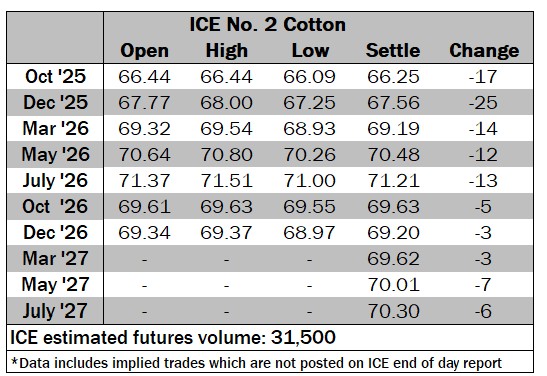 Nearby months ended between 12 to 25 points lower. December ’25 futures opened at 67.77 cents/lb (-4) and immediately moved to a high of 68.00 cents/lb (+19) as soon as the market opened. The lead month slowly met resistance over the next several hours, reversing course and falling 29 points lower around 0700 GMT. The most active contract traded near the bottom of its range over the next hour until buyers returned, lifting the nearby month back to its high for the day (68.00 cents/lb) around 1200 GMT. Sellers moved into action, causing December cotton to fall back to the downside and to a low of 67.25 cents/lb (-56) by 1340 GMT. The lead month moved off its low, trading under pressure over the rest of the session to settle at 67.56 cents/lb (-25).