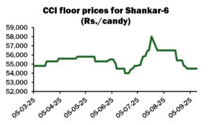 Meanwhile, the floor price for Shankar-6 at the Cotton Corporation of India (CCI) auction this afternoon is unchanged at ₹54,500 per candy (78.75 cents per lb). Around 762,000 bales are on offer, the lowest quantity since June. Total sales reached 8.2 million bales on September 10, an increase of 800,000 since August 28.