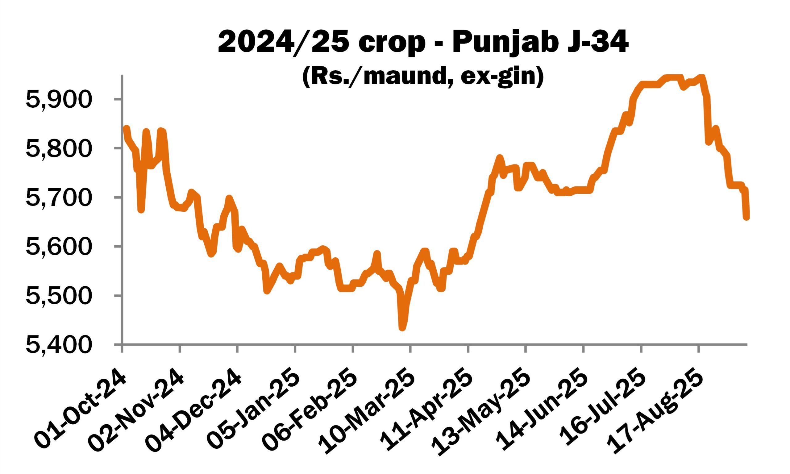 Asking rates in the domestic lint market are mixed today. The mid-point of quotes for Shankar-6 has increased by a further ₹250 to ₹55,200 per candy, ex gin (approximately 79.75 cents per lb), representing an overall gain of ₹800 since September 5. Punjab J-34 is ₹55 lower at ₹5,660 per maund, ex gin (77.90 cents per lb).