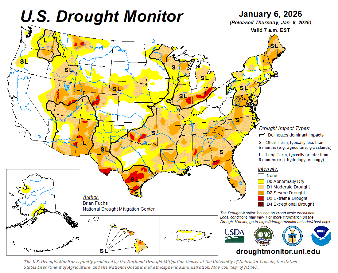 Unseasonably warm, dry weather ruled across much of the cotton belt during the week ended January 6, and consequently, soil moisture levels deteriorated in key cotton-growing areas as shown in the latest US Drought Monitor map.
