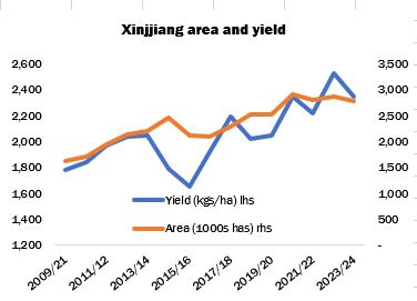 Yields have also improved markedly, to reach over 2,200 kilos per hectare in 2022/23. As yields improved, cultivated area has fallen; from a high point of almost six million hectares in 2008/09, the area planted to cotton has fallen to less than three million ha.