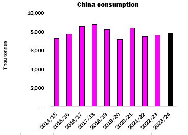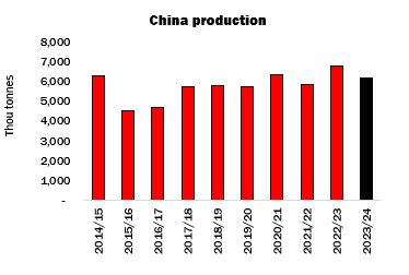 No official purchasing programme took place in 2023, while almost 885,000 tonnes were disposed of via the auction series which ran from late July to mid-November. A substantial volume of cotton is thought to have been purchased by state-owned entities on behalf of the Reserve during the 2023/24 season, but by early 2024, the volume in State Reserve warehouses was estimated by most observers to stand below the level considered optimal from Beijing’s perspective.