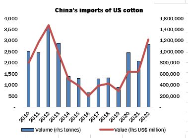 In the event, China’s purchases of US cotton in 2020 and 2021 amounted to more than 1.8 million tonnes, with a value of US$3.2 billion. A further 1.1 million were imported in 2022 (US$3.1 billion).