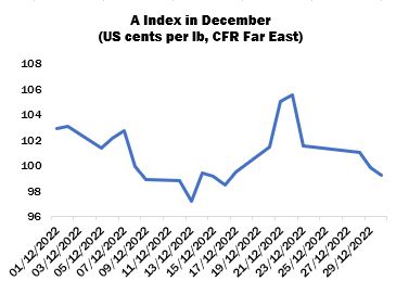 International cotton prices fluctuated in a wide range during December, owing to sharply higher and lower settlements in New York, to end overall with a decline on the period. The A Index fell to a low of 97.25 US cents per lb mid-month, before reversing direction to reach its high point (105.55) on December 22. However, prices moved lower in the following four consecutive sessions, to settle just below the dollar mark.