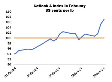 The Lunar New Year holiday paused trading in China between February 9 and 19. Upon return, the Zhengzhou cotton futures market reacted in rather muted fashion to the rallies in New York, advancing slightly in the first session before falling back and remaining in a relatively narrow range thereafter. The May contract closed at 16,200 yuan per tonne on February 29, with a net gain on the month of 155 yuan, a fraction of the rise in New York. Local spinners were still encountering slow demand from the downstream textile sectors. Meanwhile, supplies from the domestic 2023/24 crop were abundant, as were consignments of imported cotton that continued to arrive at Qingdao and other ports.