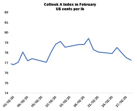 The Cotlook A Index moved in a range of less than three cents in February, ending the month barely altered at 77.25 cents per lb. In New York, however, the May delivery declined by 179 points overall, closing the month at 65.25 cents per lb, a contract low settlement. Market reaction to the release of potentially bullish supply and demand forecasts and US export reports (detailed below) was largely muted, and the negative trend was perhaps at odds with the relatively lively physical demand reported in several markets. The weakness may therefore be attributed at least in part to the significant short position held by Managed Money investors, which increased to 6.8 million bales by February 25, as well as the expectation of tariffs promised by the US and possible retaliation from the targeted trade partners.