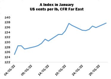 Upland offering rates continued on an upward trajectory throughout January. The Cotlook A Index gained over ten cents during the period to end the month at 137.70 cents per lb. That value represents the highest of the 2021/22 season so far and a level last recorded in June 2011. Firm basis levels and a rising New York futures market reflected bullish cotton fundamentals. March futures closed on the last day of the month with a new contract high settlement of 127.51 cents per lb.