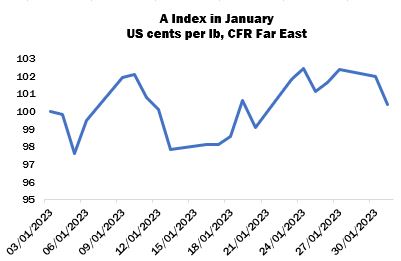 International cotton prices, as measured by the Cotlook A Index, moved either side of the dollar mark in January. Movements were on occasion volatile, in reflection of changes in the ICE futures market, which nonetheless remained within the range established in early November. The Index’s low point of 97.6 US cents per lb was recorded on January 5, while a high point (102.45) was reached almost three weeks later. The price ended January on a weaker note, to close just 40 cent points above its opening level.