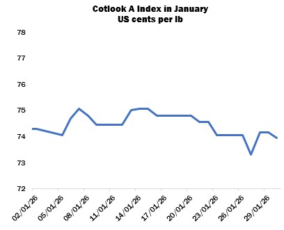 Daily arrivals slowed in India, in line with seasonal patterns. The Cotton Corporation of India had procured around 4.4 million tonnes of 2025/26 crop seed cotton by the end of the month, equivalent to perhaps 30 percent of the total expected output. Auctions of supplies from the current campaign began on January 19, and over 300,000 bales were sold in the first two weeks.
