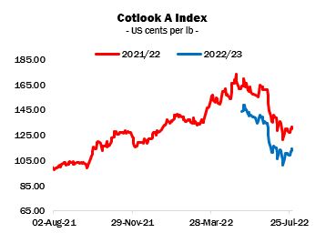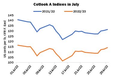 The Forward (2022/23) A Index, reflecting offers no earlier than October, has for some time been the more relevant value. It ended the period at 114.10 cents per lb, a net decline of 85 cent points, despite a strong rally during the second half of the month.