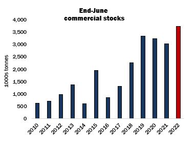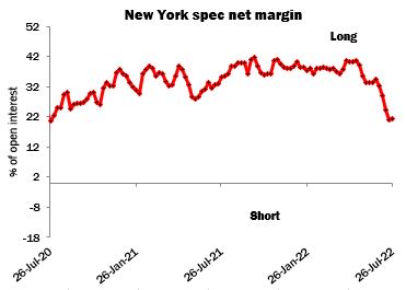 Despite the unfolding crop disaster on the Texas Plains and its implications for next season’s US balance sheet, for much of July New York was subject to downward pressure, as speculators adopted a ‘risk-off’ stance in the face of rising inflation, upward pressure on interest rates and growing fears of economic recession. By July 19, speculators’ net long position had fallen to just over 21 percent of the open interest in New York, down from over 40 percent in early May. Not until later in the month were fears of demand destruction in the textile supply chain eclipsed, at least partially, by bullish developments on the supply side.